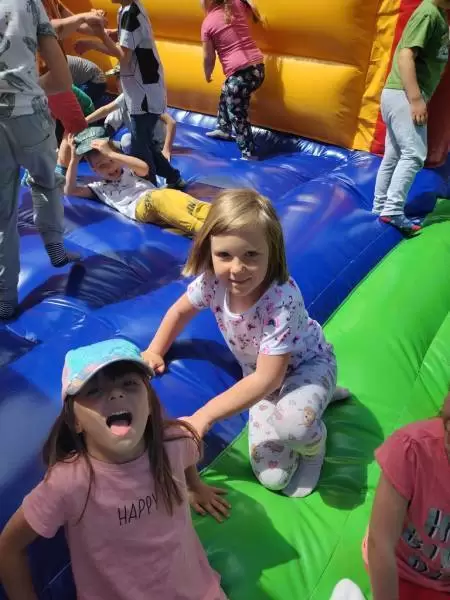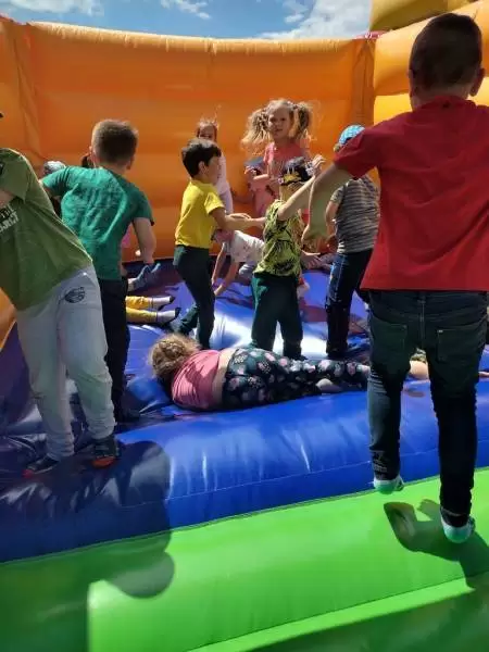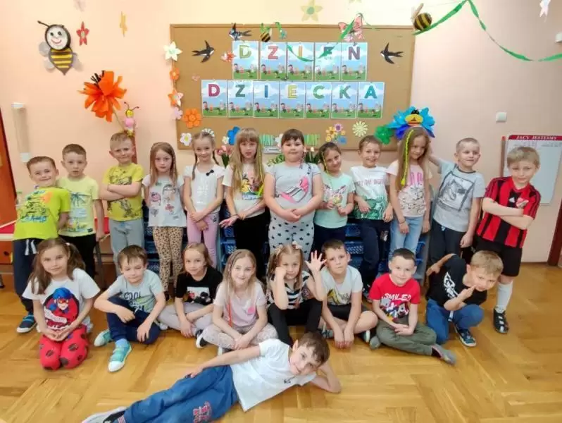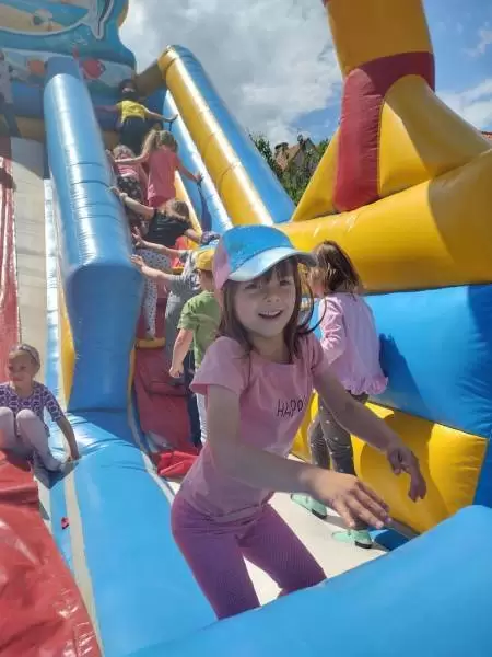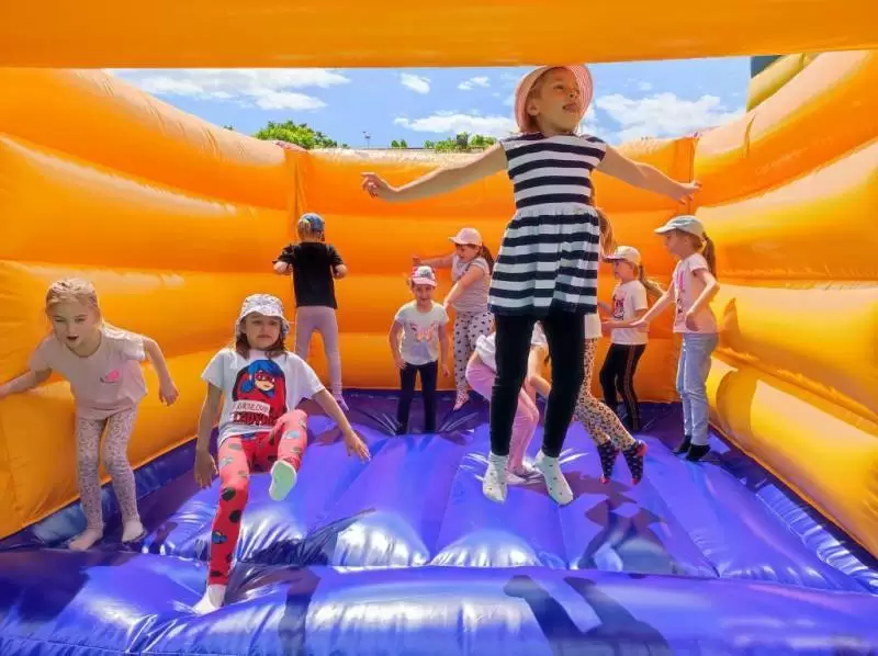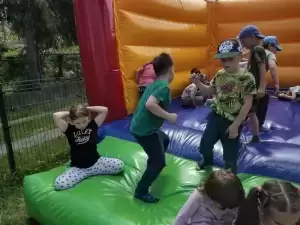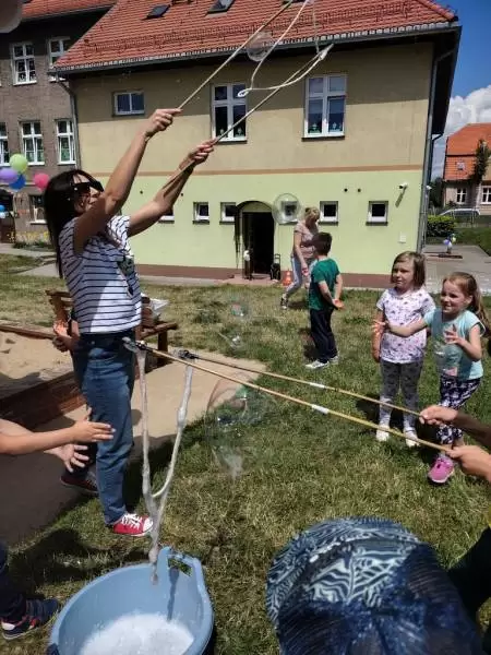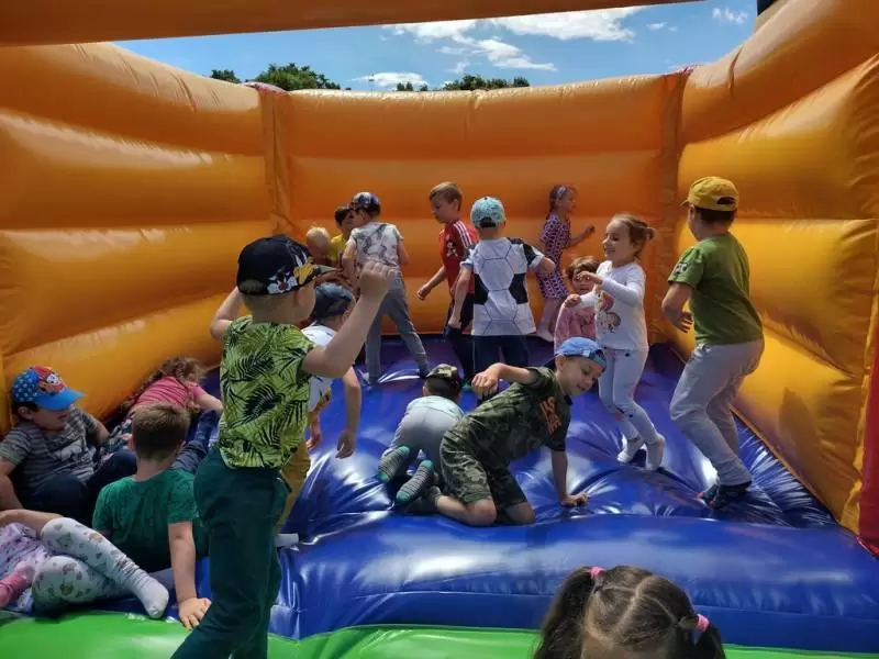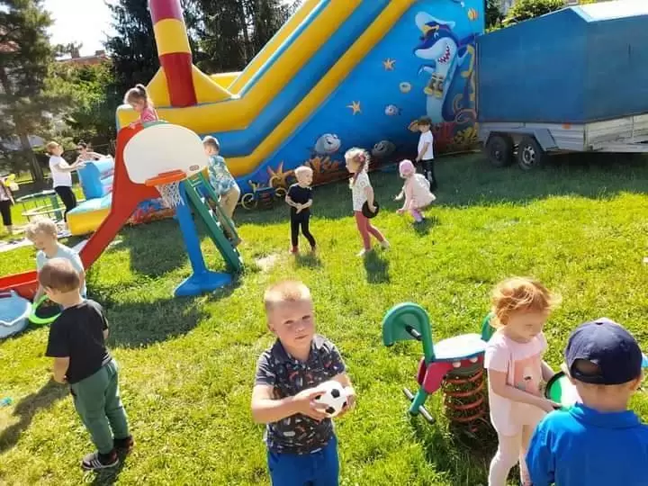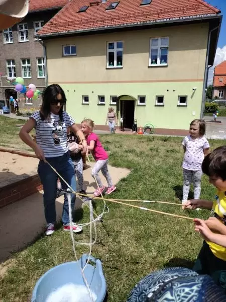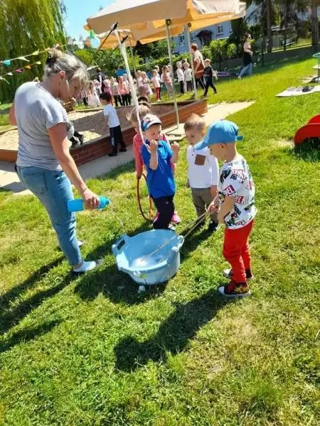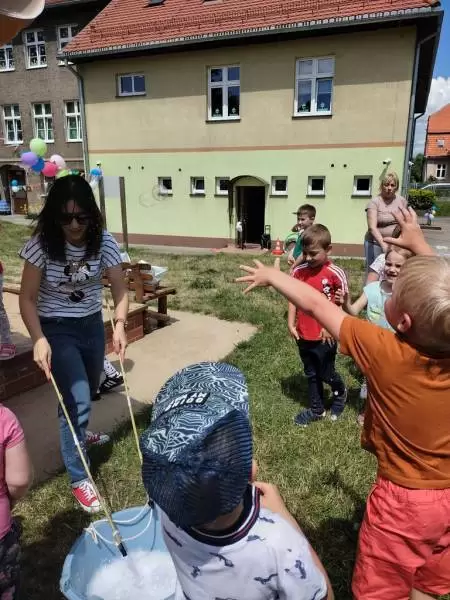 1 czerwca wszystkie dzieci od samego ranka obchodziły swoje święto. Już po śniadaniu wszystkie dzieci wesoło uczestniczyły we wspólnych zabawach przy muzyce. Kolejną niespodzianką były dmuchńce w ogrodzie przedszkolnym, pyszne smakołyki, które urozmaiciły gamę świątecznych smaków. Dzieci bawiły się w ogrodzie przedszkolnym wraz z nauczycielkami, które prowadziły wszystkie zabawy i konkursy. Do atrakcji tego dnia zaliczyć należy również przeróżne korowody, konkursy z nagrodami, zabawy przy wesołej dziecięcej muzyce zapraszającej do tańca na świeżym powietrzu, a także, pokaz baniek mydlanych w wykonaniu wszystkich chętnych dzieci, pod czujnym okiem pań.