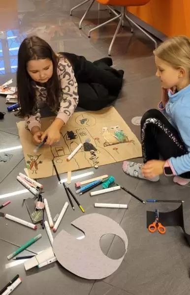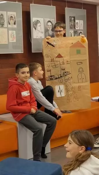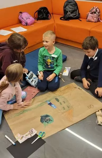 Następnym punktem Nocy Bibliotek były twórcze warsztaty z Panią Ewą Martynkien, autorką książek dla dzieci, scenarzystką seriali i programów dla najmłodszych. Uczestnicy tworzyli swoje własne scenariusze na podstawie, których powstawały kreatywne prace i opowiadania.