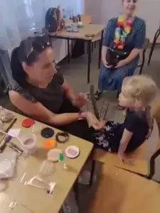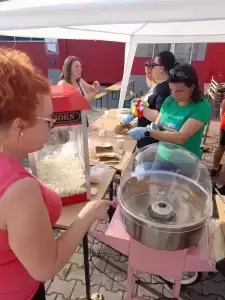 Pogoda dopisała, więc na terenie przed salą zorganizowany był poczęstunek, gdzie można było znaleźć potrawy z grilla, swojski chlebek ze smalcem, watę cukrową, popcorn, mrożoną kawę, a w środku na sali szwedzki stół, gdzie znajdowały się domowe ciasta, owoce, soki, napoje...