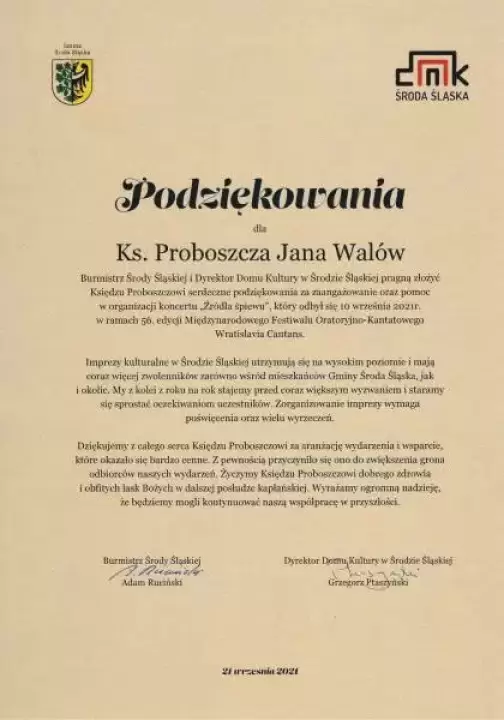 Podziękowania dla Ks. Proboszcza Jana Walów