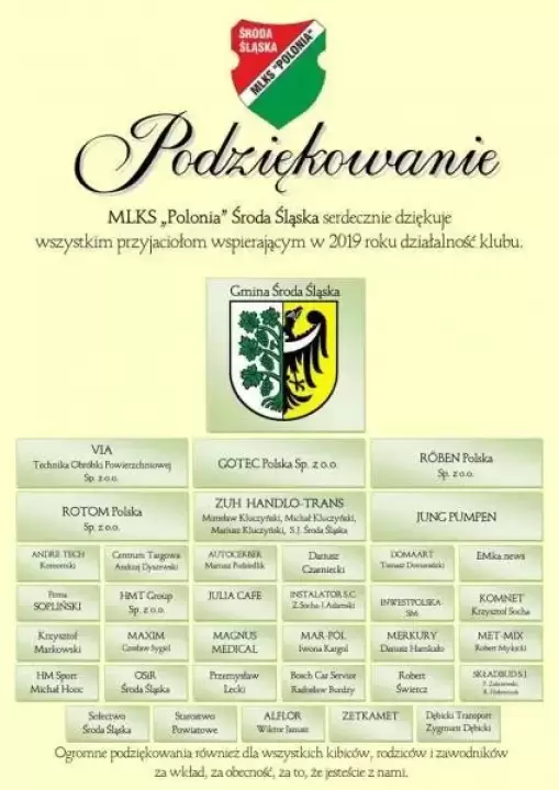 MLKS „Polonia” Środa Śląska serdecznie dziękuje wszystkim przyjaciołom wspierającym w 2019 roku działalność klubu.