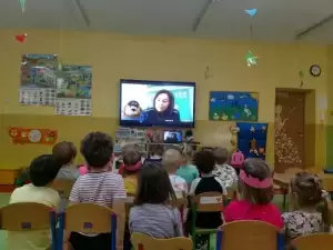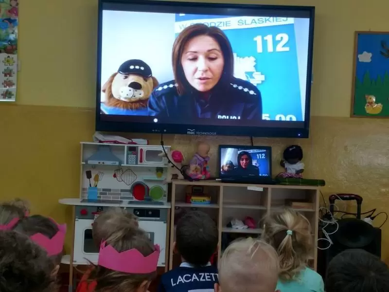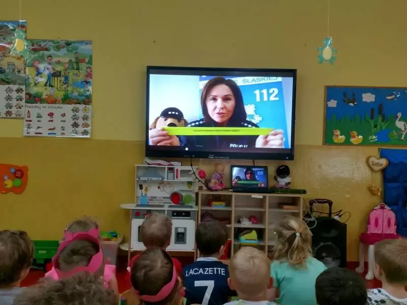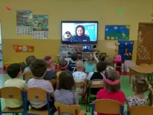 Policjantka zaprezentowała przedszkolakom z grupy Motylki książeczkę pt. "Na ulicy". Spotkanie, które odbyło się za pomocą smart urządzeń było oczywiście doskonałą okazją do przypomnienia podstawowych zasad bezpieczeństwa na drodze.