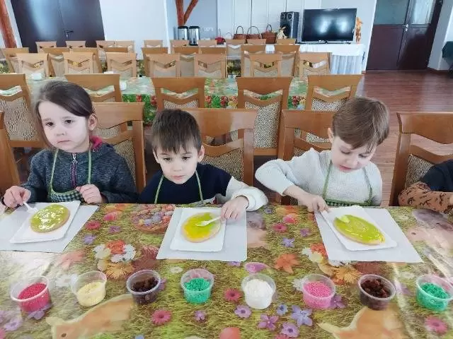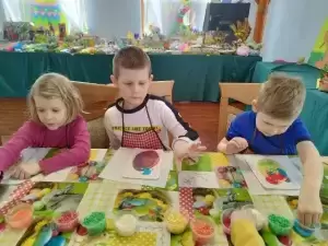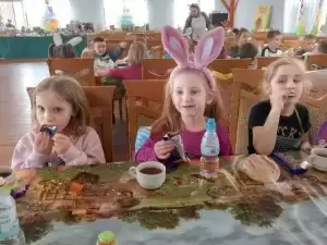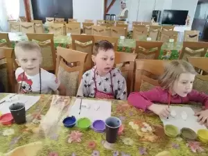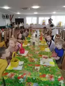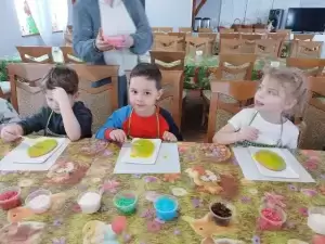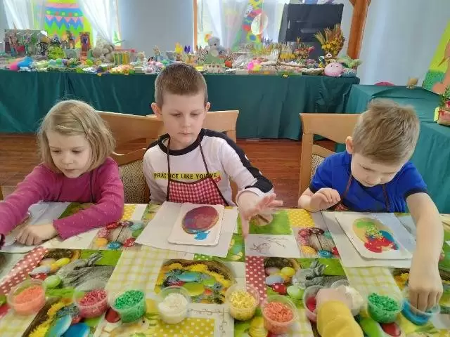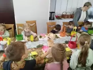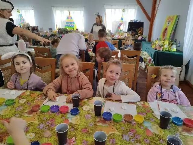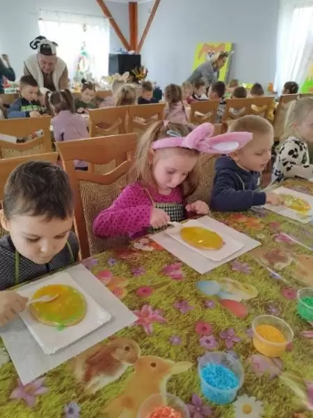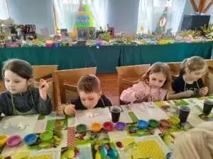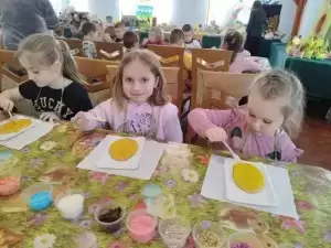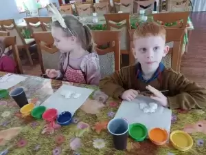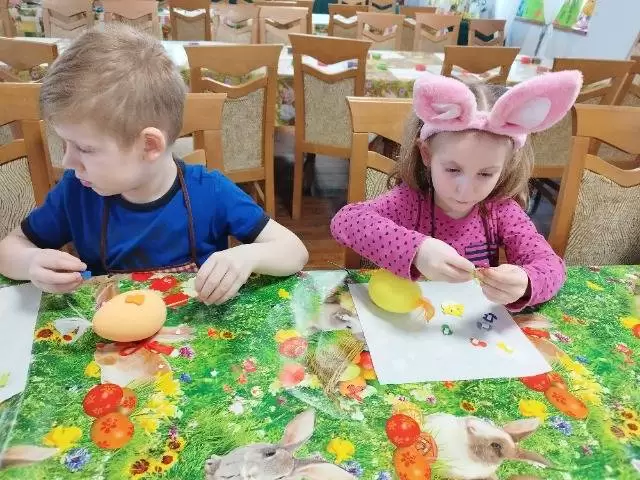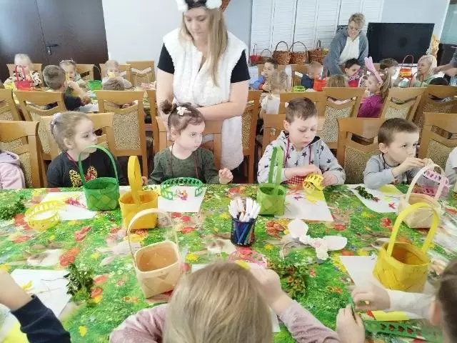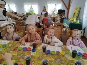 Podczas zajęć dzieci ozdabiały wielkanocne zające, kurczaczki i jajka. Zdolności plastyczne i manualne, to mocna strona naszych przedszkolaków. Za pomocą różnorodnych materiałów w mig stworzyły piękne ozdoby, aby z dumą zabrać je w prezencie do domu. Wspólne warsztaty wspaniale pobudzają wyobraźnię i angażują do wspólnej aktywności. Nie zabrakło też czasu na wspólną zabawę i tańce.