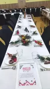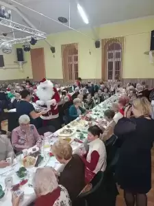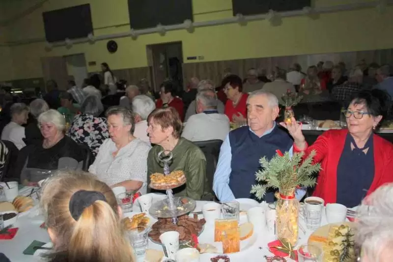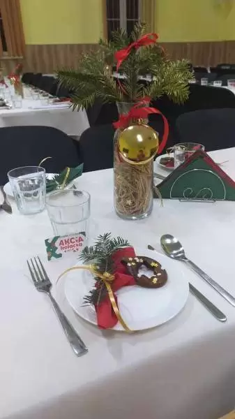 Uczestnicy degustowali pyszny barszcz z uszkami, pierogi z kapustą, fantastyczną rybkę, sałatkę jarzynową i krokiety. Na stole były piękne, świąteczne kompozycje w postaci jadalnych choinek. Każdy mógł napić się grzanego wina lub piwa z korzennymi przyprawami. Całość uświetniły występy wokalne dziewczynek – Zosi Piotrowskiej, Emilii Nadbrzeskiej, Oli Mazur, Hani Pasierbek i Justyny Dyndy. Gwiazdą wieczoru była Oliwia Bachowska, która zaśpiewała śliczne pastorałki i kolędy. Występujący otrzymali gromkie brawa. Na zakończenie do spotkania dołączył Święty Mikołaj i obdarował gości drobnymi podarunkami. Uśmiech radości pojawił się na wszystkich twarzach.