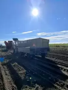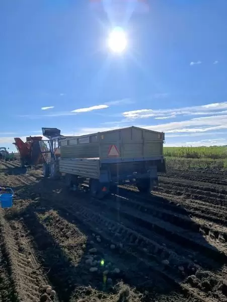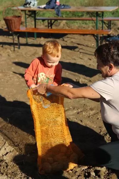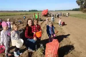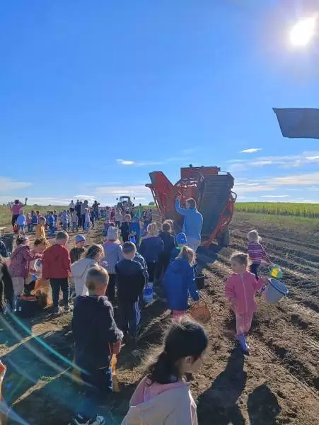 Państwo Szafran zaprosili wszystkie dzieci na swoje pole, aby zobaczyły jaki sprzęt służy do wykopywania ziemniaków oraz jak wygląda cały proces zbierania ich. Miały również okazję własnoręcznie zbierać ziemniaki z pola do worków i na przyczepę.