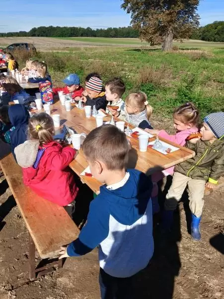 Państwo Szafran wraz z Panią Martą Nowak zadbali o to, aby przedszkolaki nie były głodne. Na specjalnie przygotowanych i ustawionych stołach pośrodku pola pojawiły się kiełbaski z grilla, pieczone ziemniaki, soki oraz paluszki i cukierki.