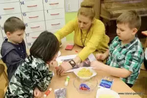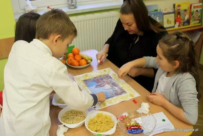 Następnie przedszkolaki, wraz z wychowawcami, zajęły się pracami artystycznymi. Każda z reprezantacji musiała utworzyć obrazek z puzzli, który następnie przystrojono makaronem. Powstały przepiękne prace, które udekorują szkolne korytarze.