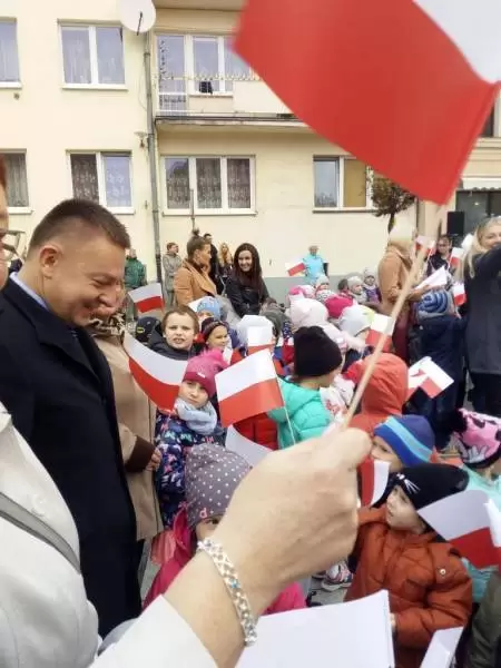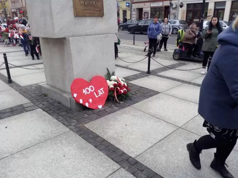 Maluchy, z biało - czerwonymi flagami w rękach, podkreślały doniosłość święta. Złożyły pod Pomnikiem Żołnierzom Polskim serce z napisem "100 lat", a pani dyrektor, wieniec.