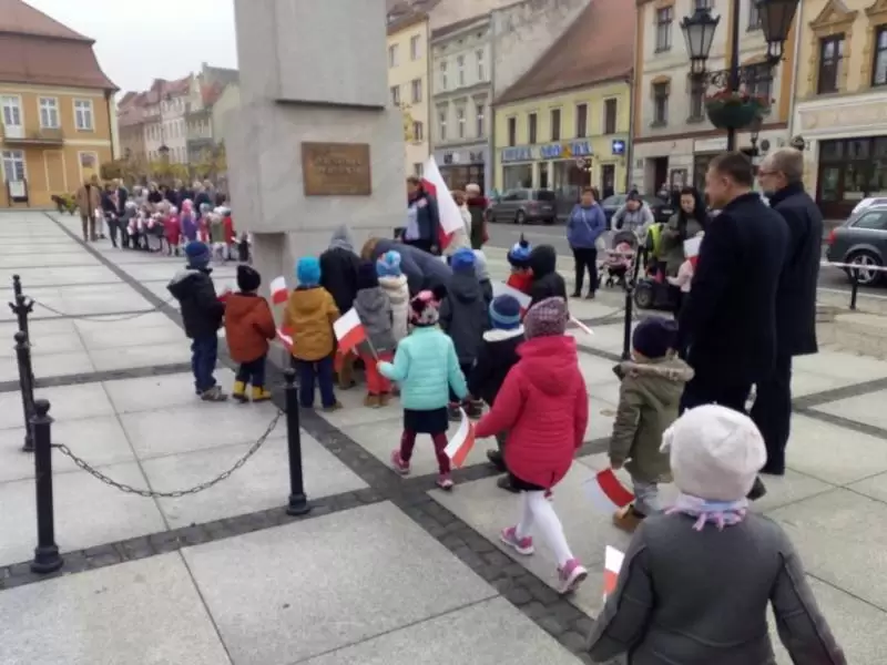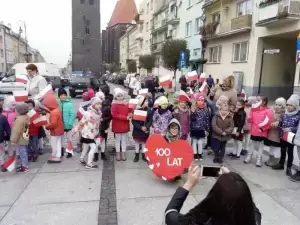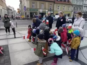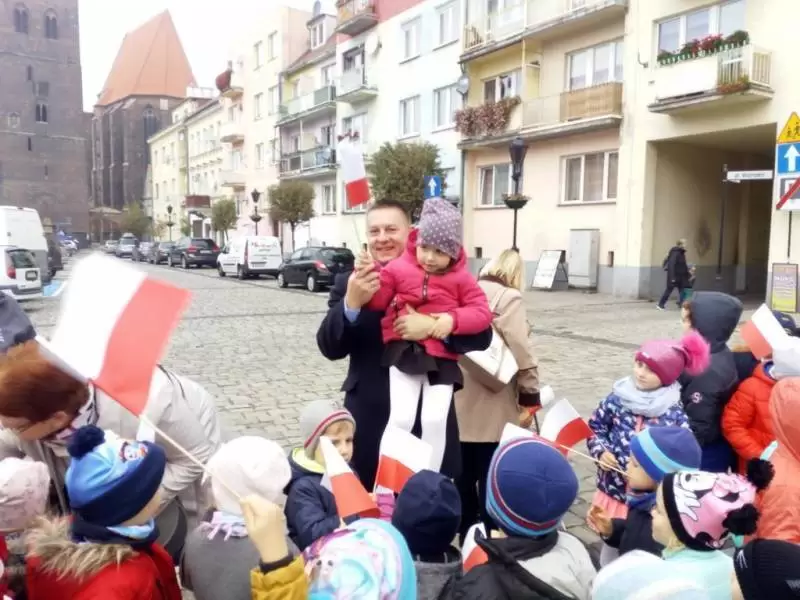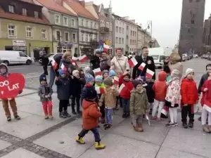 Dziś w średzkim rynku przedszkolaki z Przedszkola Publicznego nr 3 w Środzie Śląskiej, wspólnie z nauczycielkami, panią dyrektor i burmistrzem naszego miasta, uświetniły 100. rocznicę odzyskania Niepodległości.