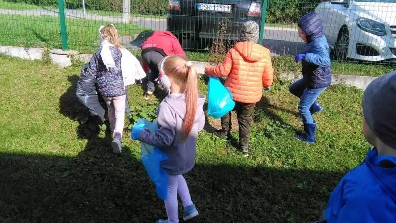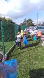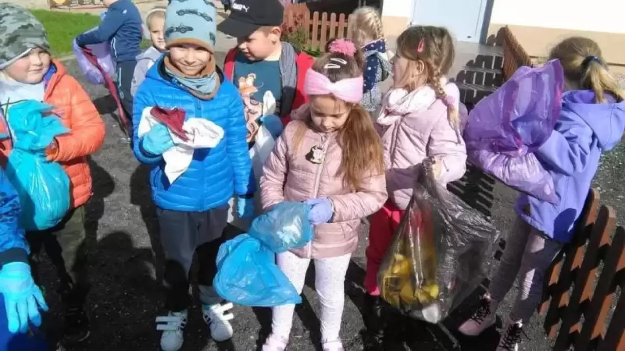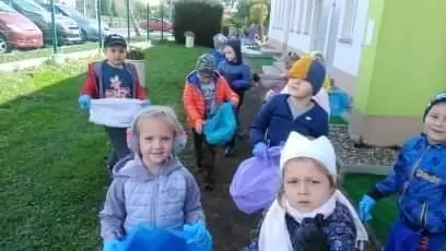 Dzieci przeszły wokół przedszkola w celu uporządkowania naszej przestrzeni, a także zauważenia, że wyrzucanie śmieci wokół siebie jest złe.