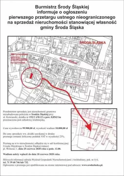 Burmistrz Środy Śląskiej informuje o ogłoszeniu pierwszego przetargu ustnego nieograniczonego na sprzedaż nieruchomości stanowiącej własność gminy Środa Śląska.