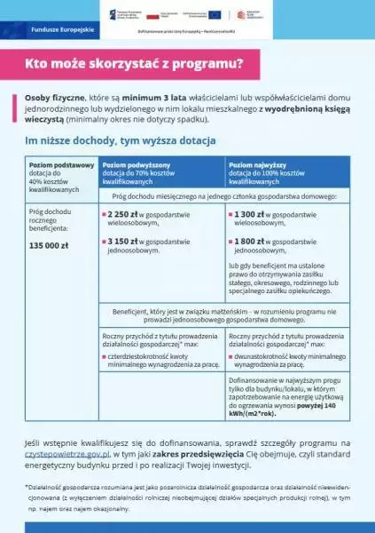 O dofinansowanie mogą występować osoby fizyczne, które są właścicielami lub współwłaścicielami domu jednorodzinnego lub wydzielonego w nim lokalu mieszkalnego z wyodrębnioną księgą wieczystą. Minimalny okres tej własności musi wynosić 3 lata przed złożeniem wniosku o dofinansowanie. Wymóg ten nie dotyczy sytuacji spadkowych. Ponadto muszą spełniać kryteria dochodowe określone w programie, a w przypadku najwyższego dofinansowania – także wymogi dotyczące standardu energetycznego budynku.
