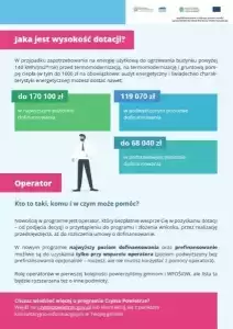 To rozwiązanie zastosowane po raz pierwszy w programie Czyste Powietrze, które obowiązuje od 31 marca br. Rolą operatorów jest wsparcie beneficjentów najwyższego i podwyższonego poziomu dofinansowania, w tym wszystkich beneficjentów korzystających z prefinansowania. Operator poprowadzi beneficjenta krok po kroku przez całą ścieżkę w programie i zapewnia pełną opiekę i wsparcie od podjęcia decyzji o realizacji inwestycji, przez proces inwestycyjny, aż do jego zakończenia i rozliczenia umowy o dofinansowanie.