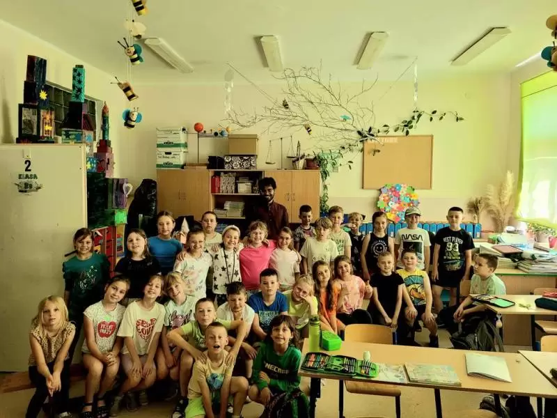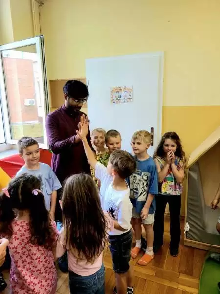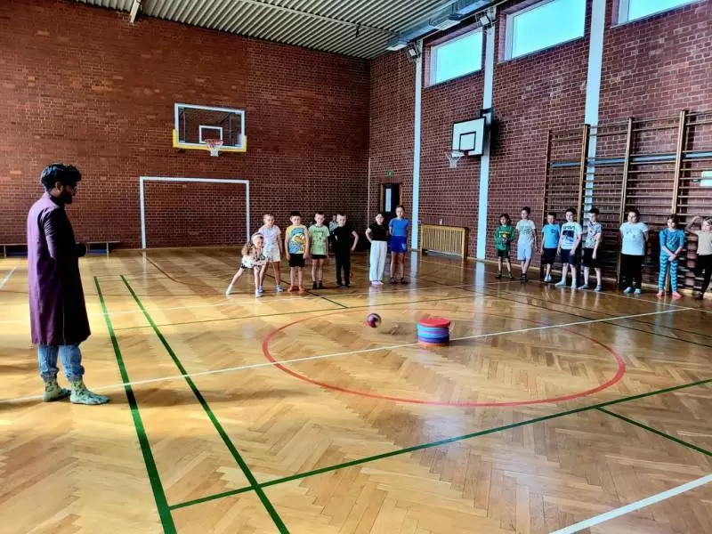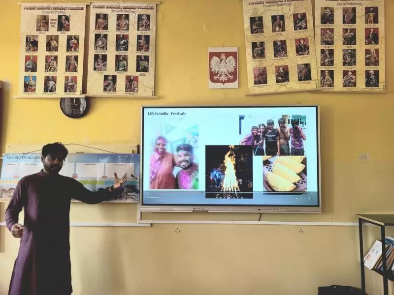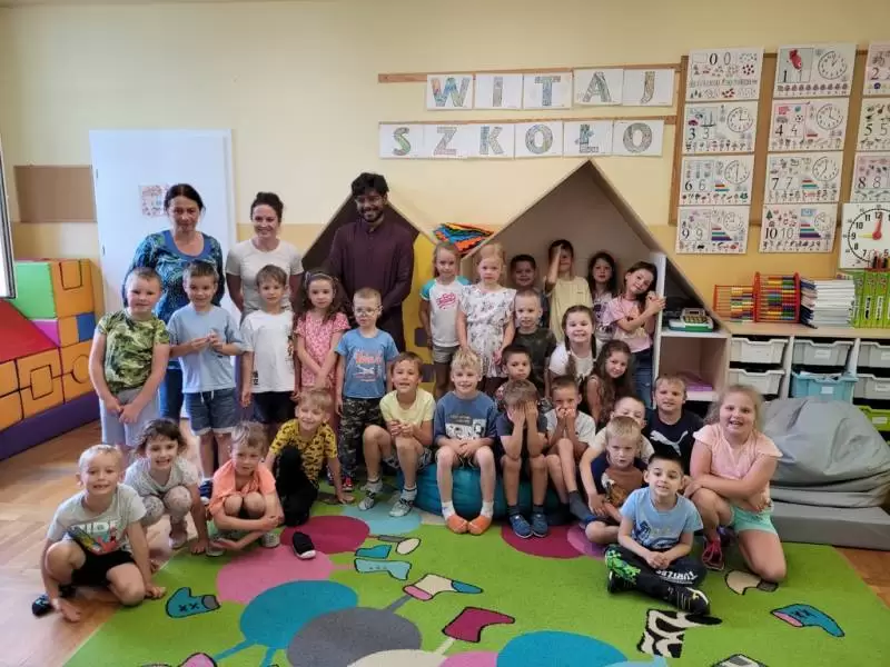 Tarang Agrawal przybył do nas z miasta Ratlam w Indiach i od 7 lat mieszka i pracuje we Wrocławiu. Uczniowie z ogromnym zainteresowaniem słuchali o kulturze, tradycjach i świętach- poznaliśmy Diwali (Święto Świateł) oraz Holi (Święto Kolorów). Dowiedzieliśmy się dlaczego krowy i kozy są w Indiach tak ważne a słoniom maluje się trąby. Zobaczyliśmy też, jakie zwierzęta można spotkać na ulicach. Na koniec mieliśmy okazję skosztować jednej z indyjskich przekąsek - Pani Puri. Dla chętnych nie zabrakło też malowania henną, co cieszyło się dużą popularnością wśród naszych uczennic. Uczniowie z młodszych klas mogli poznać gry i zabawy popularne w Indiach, klasy 7a i 8a uczestniczyły w grze symulacyjnej Bafa Bafa.