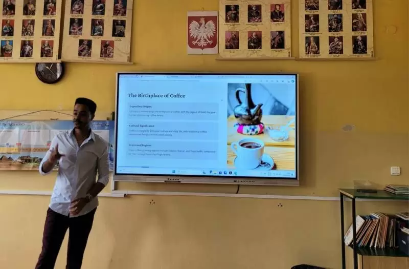 Zelalem Mekonnen pochodzi z Etiopii i również od kilku lat mieszka i pracuje we Wrocławiu. Podczas warsztatów opowiedział nam kilka ciekawostek o swoim kraju, m.in. tym, że to właśnie z Etiopii pochodzi kawa, istnieje tam aż 86 grup etnicznych i każda z nich posiada swój własny język, alfabet składa się z aż 280 znaków a rok ma 13 miesięcy! W Etiopii występuje też ponad 100 gatunków zwierząt, których nie spotkamy nigdzie indziej na świecie. Jest to też jedyny kraj w Afryce, który nigdy nie został skolonizowany i do dzisiaj z tego powodu jest przykładem dla innych państw walczących o niezależność.