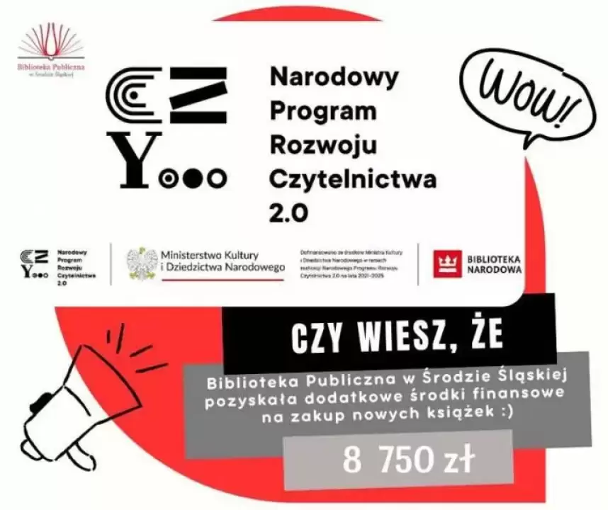 Biblioteka Publiczna w Środzie Śląskiej otrzymała dofinansowanie w kwocie 8 750 zł na ze środków finansowych Ministra Kultury i Dziedzictwa Narodowego w ramach realizacji Narodowego Programu Rozwoju Czytelnictwa 2.0 na lata 2021-2025 na zakup nowości wydawniczych oraz usług zdalnego dostępu do książek w formatach e-booków i/lub synchrobooków - Priorytet 1, Kierunek Interwencji 1.1 w ramach NPRCz 2.0.