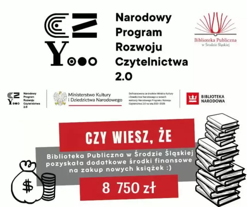 Biblioteka Publiczna w Środzie Śląskiej otrzymała dotację ze środków finansowych Ministra Kultury i Dziedzictwa Narodowego w wysokości 8750 zł.