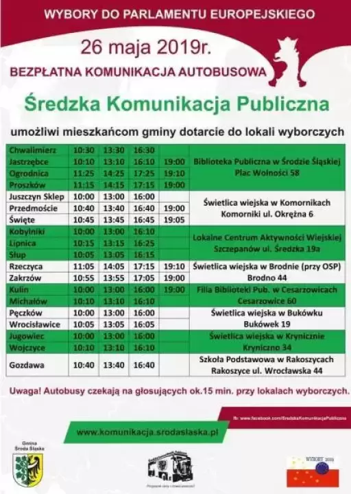 W dniu 26 maja br. ŚKP umożliwi mieszkańcom gminy Środa Śląska bezpłatne dotarcie do lokali wyborczych.
