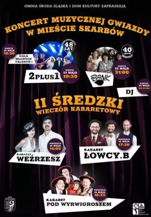 Dom Kultury w Środzie Śląskiej zaprasza 26 maja do średzkiego rynku na II Średzki Wieczór Kabaretowy. Czeka nas spotkanie z trzema niepowtarzalnymi kabaretami: POD WYRWIGROSZEM, ŁOWCY B. oraz WEŹRZESZ.