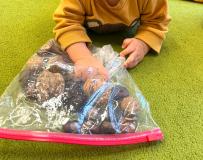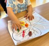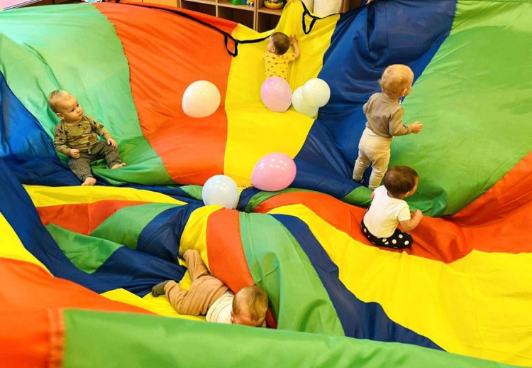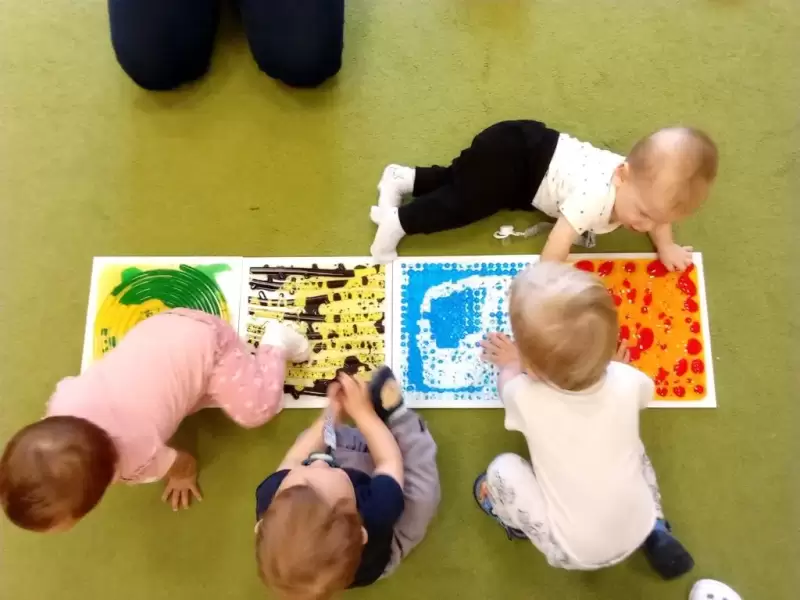 Maluszki z radością spędziły czas w basenie z kolorowymi kulkami, co wywołało dużo uśmiechu na ich twarzach. "Szafirki" uczestniczyły również w zabawach z matami sensorycznymi oraz tworzyły różne prace plastyczne, dzięki którym poznawały nowe faktury, barwy i wspierały rozwój motoryki małej. Kolejną atrakcją był magiczny dywan, na którym pojawiały się obrazy reagujące na ruch, wzbudzające duże zainteresowanie u dzieci. Maluchy próbowały dotykać przesuwających się elementów i śledziły zmieniające się obrazy.