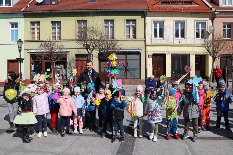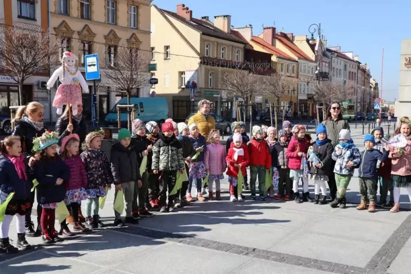 Dzieci miały ze sobą kukiełki z wizerunkiem „Pani Wiosny” oraz Marzanny, symbol kończącej się zimy. Przedszkolaki zaprezentowały wierszyki i piosenki o wiośnie. Sekretarz Gminy Marcin Nowakowski w imieniu burmistrza odebrał z rąk dzieci upominek z okazji powitania wiosny w postaci wiosennego kwiatu.