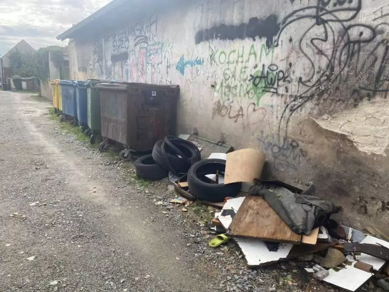 Jeśli to za mało, jeszcze „pokaźniejsza wystawa” ogumienia znajduje się na ul. Białoskórniczej. A do kolekcji: stara wersalka, elementy samochodu, tekturowe pudło po sprzęcie rtv, a na nim kolekcja butelek po napojach wyskokowych. Obraz jak z meksykańskiej dzielnicy ubóstwa i nędzy…