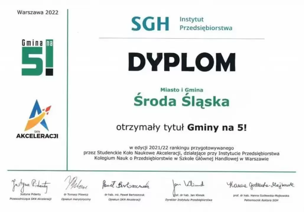 Gmina Środa Śląska została wyróżniona w corocznym raporcie „Gmina na piątkę. Dobre praktyki w obsłudze przedsiębiorców”, prowadzonym przez Studenckie Koło Naukowe Akceleracji, działające przy Instytucie Przedsiębiorstwa Szkoły Głównej Handlowej w Warszawie. Na podstawie uzyskanych punktów Gmina otrzymała tytuł „Gminy na 5”.