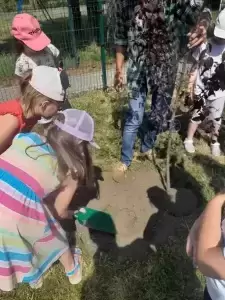 Przedszkolaki wspólnie z rodzicami wpadły na pomysł, że zanim jednak naprawdę opuszczą mury przedszkola i przekroczą szkolne progi, pozostawią po sobie jakąś pamiątkę. Tą pamiątką są wspaniałe drzewka, które zostały wczoraj w ogrodzie przedszkolnym, oczywiście z pomocą pana konserwatora, posadzone przez starszaków.