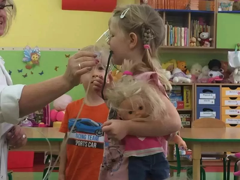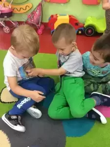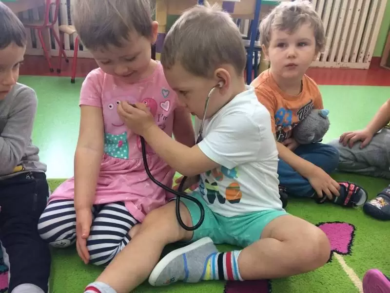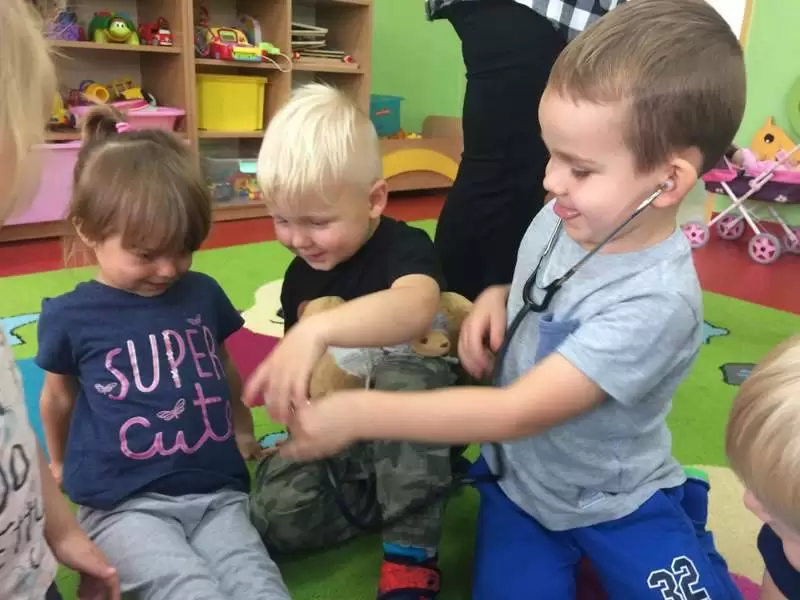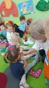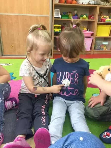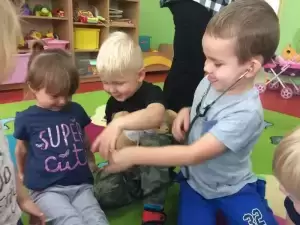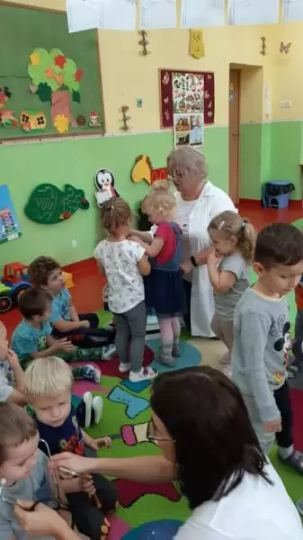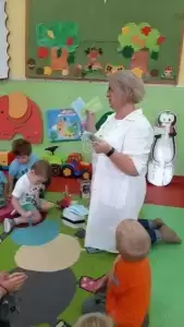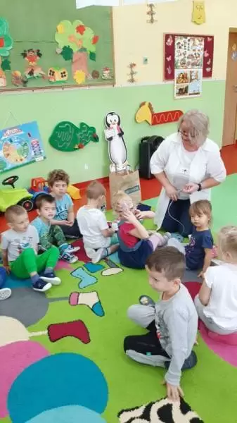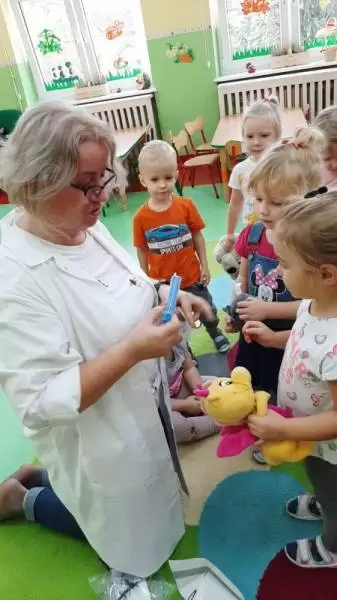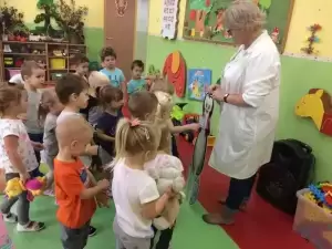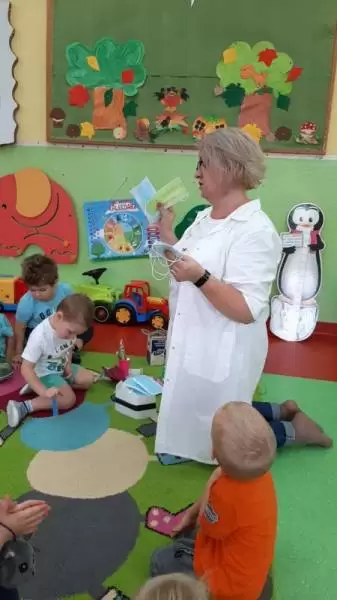 Dzieci w trakcie wspólnego spotkania rozmawiały na temat zarazków, bakterii, dowiedziały się jakie znaczenie dla zdrowia ma częste i dokładne mycie rąk. Zaprezentowane zostały również środki higieniczno - opatrunkowe oraz podstawowy sprzęt medyczny.