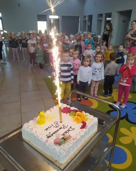 Były wspólne tańce, zagadki, dzieci poznały misie z bajek tych nowszych i starszych. Jednak największą atrakcją był słodki tort przygotowany dla naszego solenizanta.