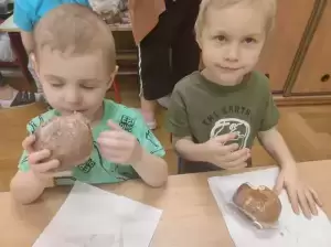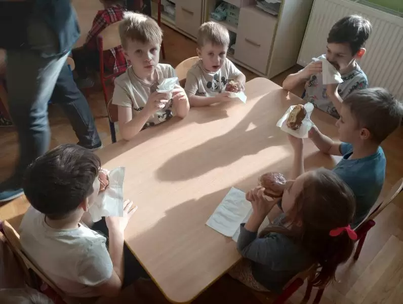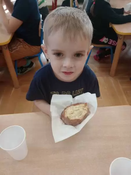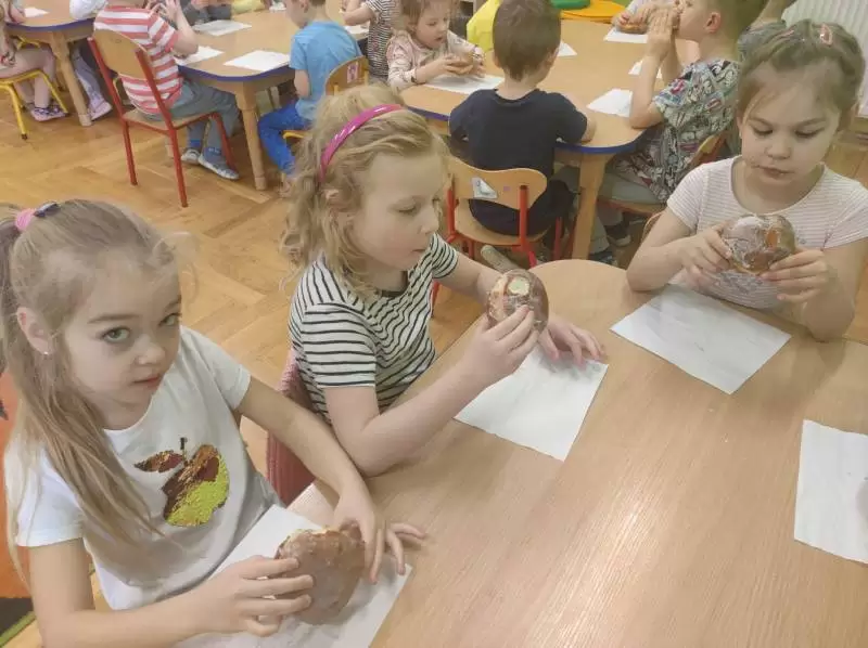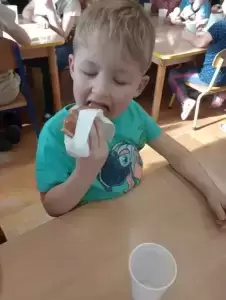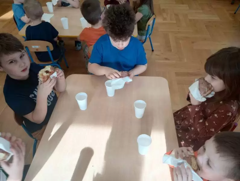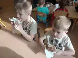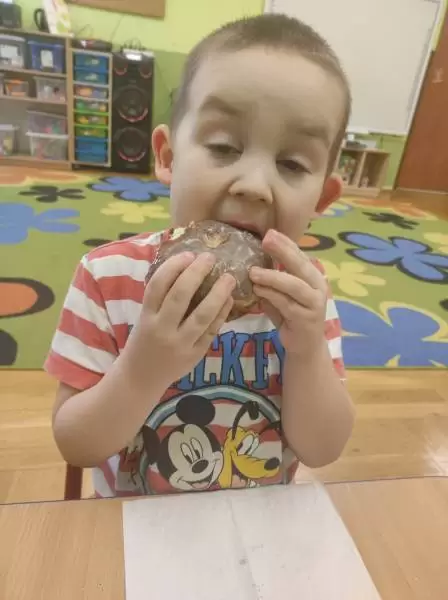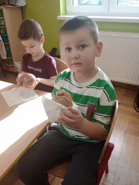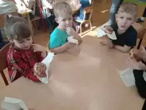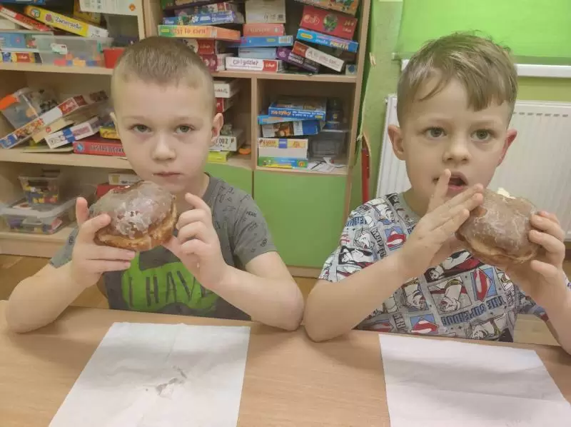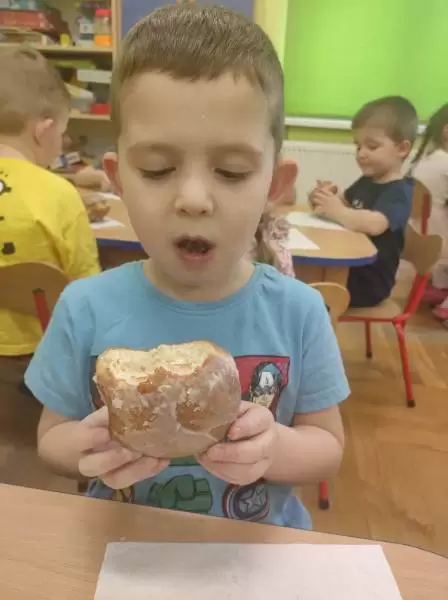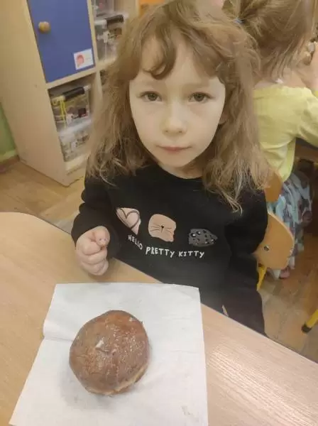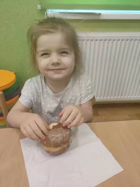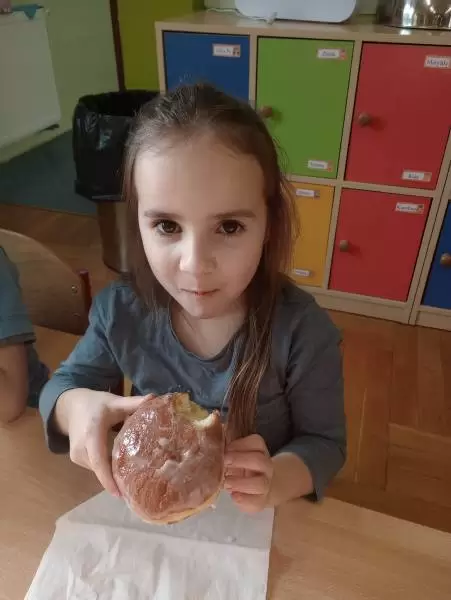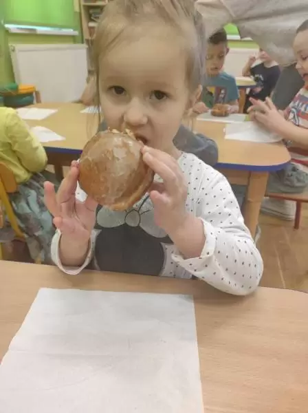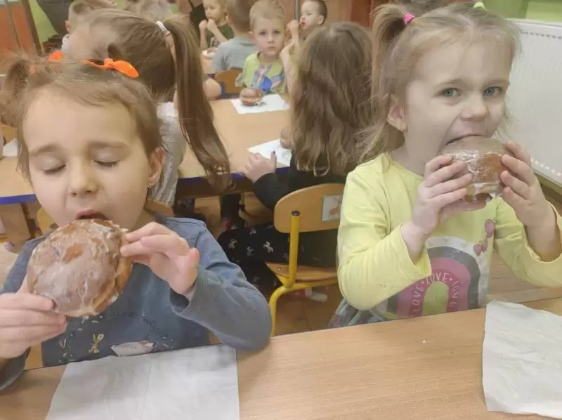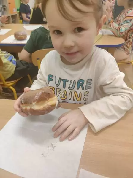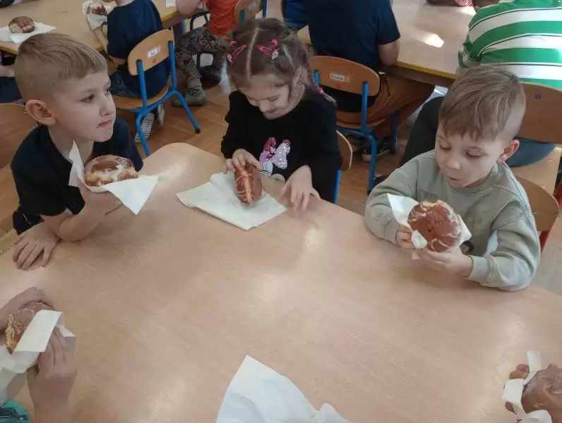 Dzieci poznały tradycję i obrzędy związane z tym świętem, co spowodowało, że nie mogły doczekać się podwieczorku. Przedszkolaki degustowały pyszne pączki upieczone przez nasze kochane panie kucharki, które z pewnością przyniosą im dużo szczęścia! Czego wszystkim bardzo życzymy!