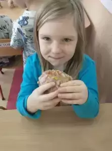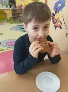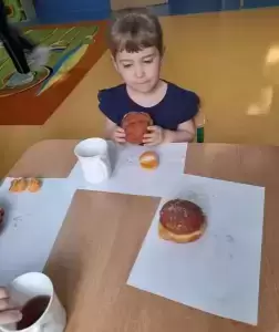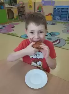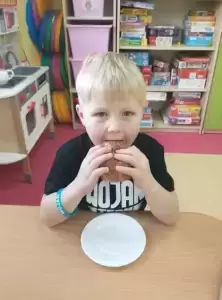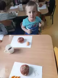 Dzieci degustowały pyszne pączki upieczone przez nasze kochane panie kucharki, które z pewnością przyniosą im dużo szczęścia! Czego bardzo życzymy!