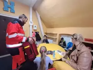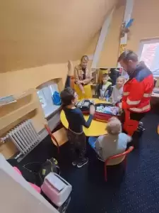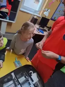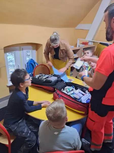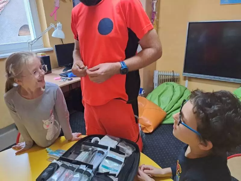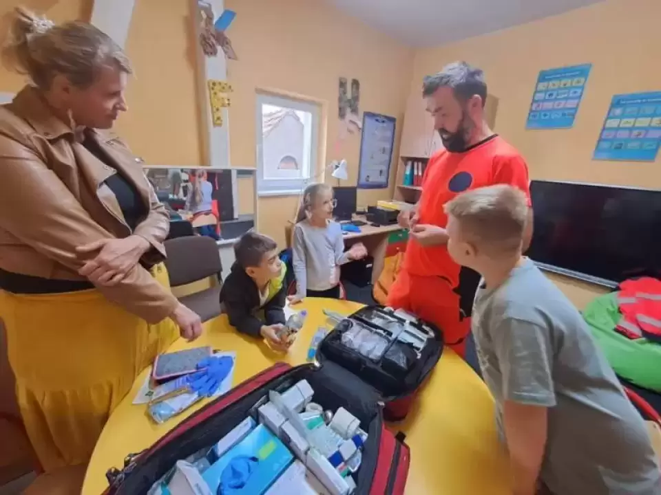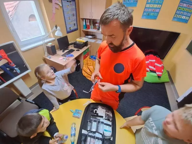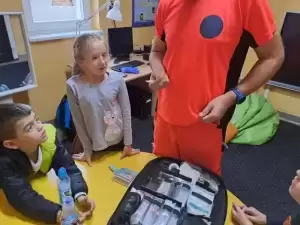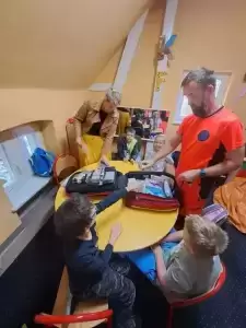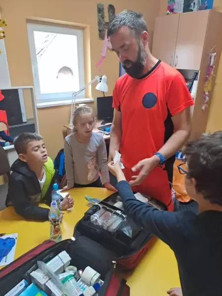 Na te wszystkie pytania odpowiedział dzieciom na zajęciach rozwijających kompetencje emocjonalno-społeczne pan Bartłomiej - ratownik medyczny pracujący w Pogotowiu Ratunkowym we Wrocławiu, który pokazał nam profesjonalną apteczkę ratunkową.
