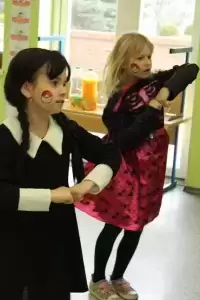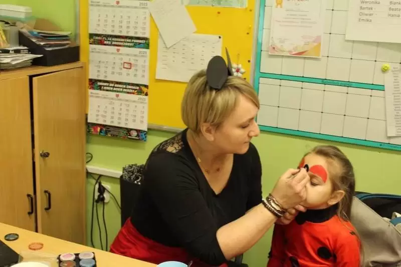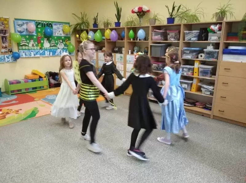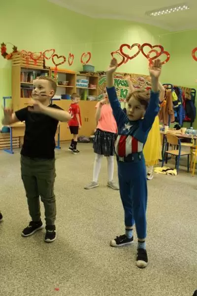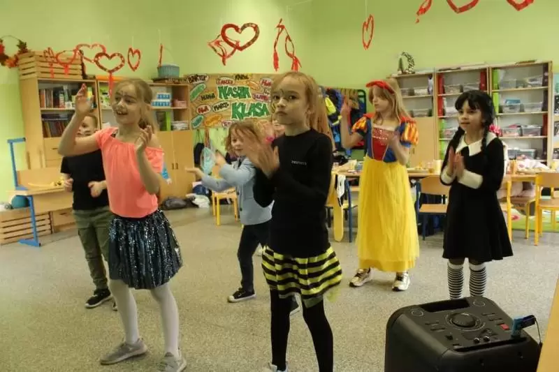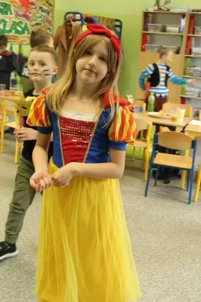 Uczniowie przebrani za bohaterów bajek bawili się przy muzyce. Były tańce, zabawy integracyjne, zabawy z dawnych lat oraz śpiewy przy dźwiękach muzyki dyskotekowej.