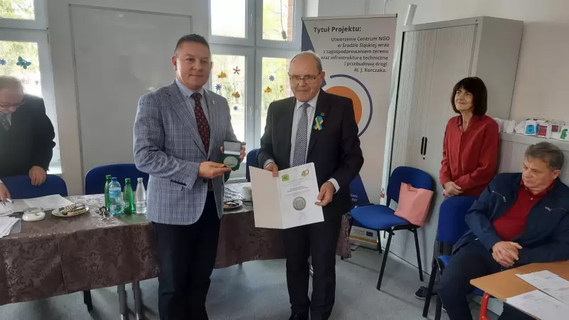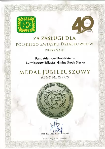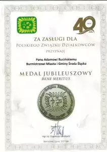 W czasie obrad Walnego Zebrania działkowców z ROD XX-lecie w gminnym Centrum NGO Prezes Okręgowego Zarządu PZD we Wrocławiu Janusz Moszkowski wręczył burmistrzowi Adamowi Rucińskiemu Medal Jubileuszowy za zasługi na rzecz PZD.