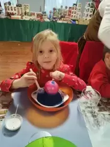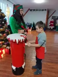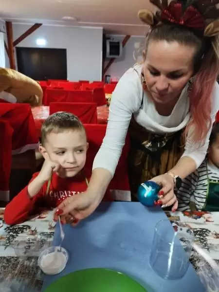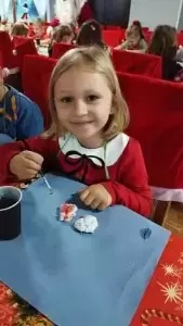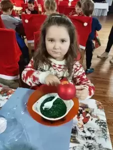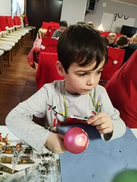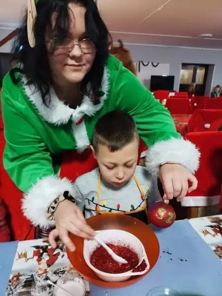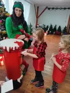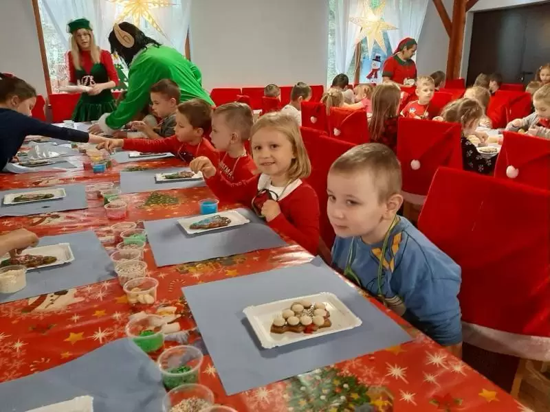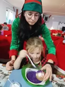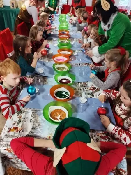 W trakcie wizyty razem ozdabialiśmy pierniczki dla Mikołaja. Do wyboru były naturalne lukry, bakalie i kolorowe posypki. Każdy mógł ozdobić tak jak podpowiadała mu wyobraźnia. Elfy pomagały w przygotowaniu gipsowych ozdób na Święta. Dzieci własnoręcznie malowały tradycyjną, szklaną bombkę obsypując ją kolorowymi brokatami.