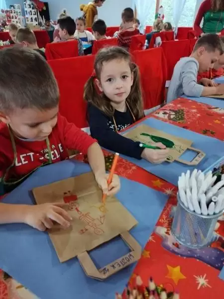 Dekorowana była także świąteczna torebka, do której spakowane zostały wszystkie upominki. Podczas spotkania był czas na wspólne zdjęcia, na napisanie listu do Mikołaja oraz nawet wspólne tańce!
