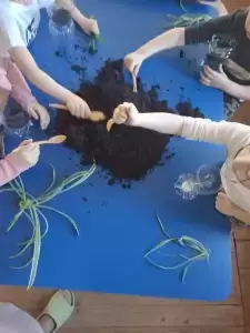 Postanowiliśmy założyć kącik przyrodniczy, który jest ważnym elementem dekoracyjnym i dydaktycznym w naszej sali. Zajęcia praktyczne poprzedzone były pogadankami na temat cyklu życia roślin i niezbędnych im warunków do rozwoju. Następnie sadziliśmy różne rośliny – ozdobne kwiaty w doniczkach. Jagódki wykonały z plastikowych butelek doniczki. Później pozostało codzienne doglądanie i pielęgnacja roślinek.