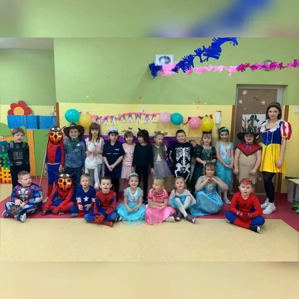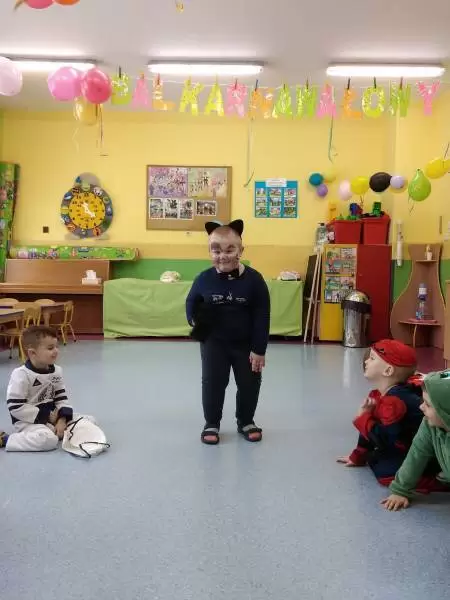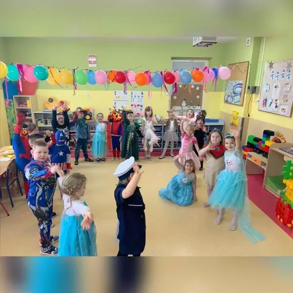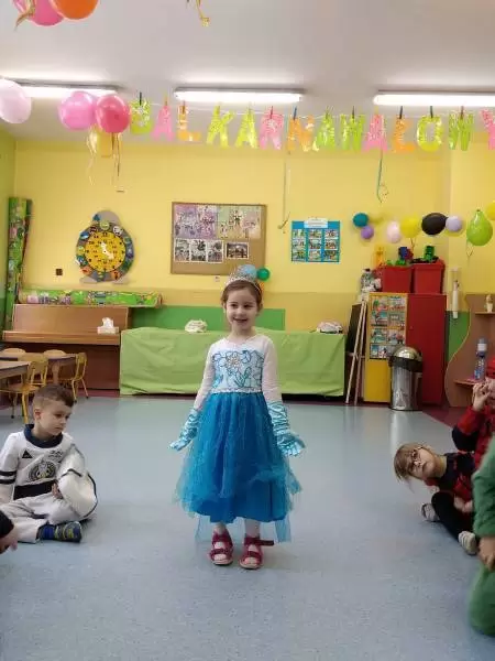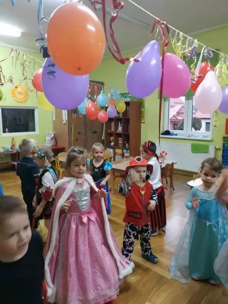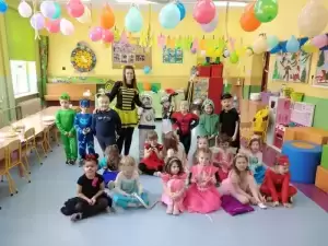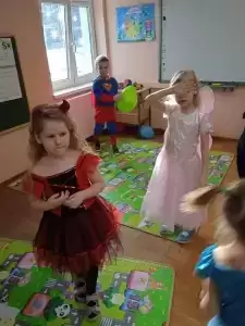 Przedszkolaki przebrane były w barwne, kolorowe i pomysłowe stroje, odzwierciedlające bohaterów ulubionych bajek. W tych dniach nie mogło zabraknąć tańców przy rytmach wesołej muzyki, zabaw i konkursów.