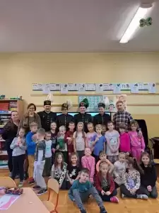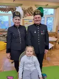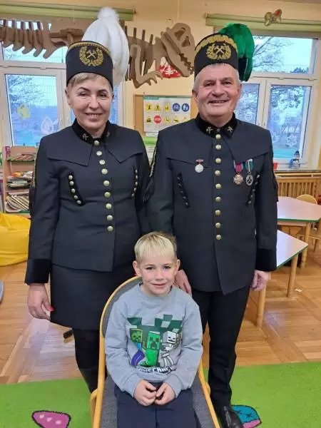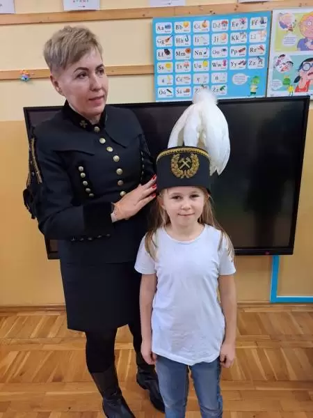 Prezes Zarządu - pan Janusz Kozyrski opowiedział o ciężkiej i często niebezpiecznej pracy wykonywanej w tym zawodzie. Przybliżył uczniom wszystkie skarby, jakie kryje ziemia. Dzieci miały również okazję przyjrzeć się z bliska mundurowi galowemu oraz czapce górniczej "czako", przystrojonej pióropuszem, którego kolor odpowiada wykonywanej funkcji w kopalni. Biały pióropusz oznacza sztygara, czerwony nosi orkiestra, biało - czerwony noszą panie, które pracują na powierzchni kopalni, zielony ma dyrekcja, a najwięcej jest czarnych, które noszą górnicy pracujący pod ziemią. Doświadczony górnik wyjaśnił również jakiego rodzaju odznaczenia otrzymują górnicy za zasługi i długoletnią pracę.