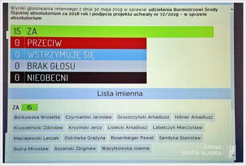 Następnie radni zajęli się sprawozdaniem z wykonania budżetu Gminy za 2018 r., wysłuchali prezentacji Skarbnika i Burmistrza w tym zakresie oraz po krótkiej dyskusji z udziałem przewodniczącego Komisji Budżetowej Arkadiusza Hibnera, głosowali nad udzieleniem Burmistrzowi absolutorium z wykonania budżetu Gminy Środa Śląska za rok poprzedni. Po prezentacji sprawozdania z wykonania budżetu gminy Środa Śląska za rok 2018 radni w jednogłośnym głosowaniu - 15 głosów za - udzieli absolutorium Burmistrzowi Środy Śląskiej za rok 2018.