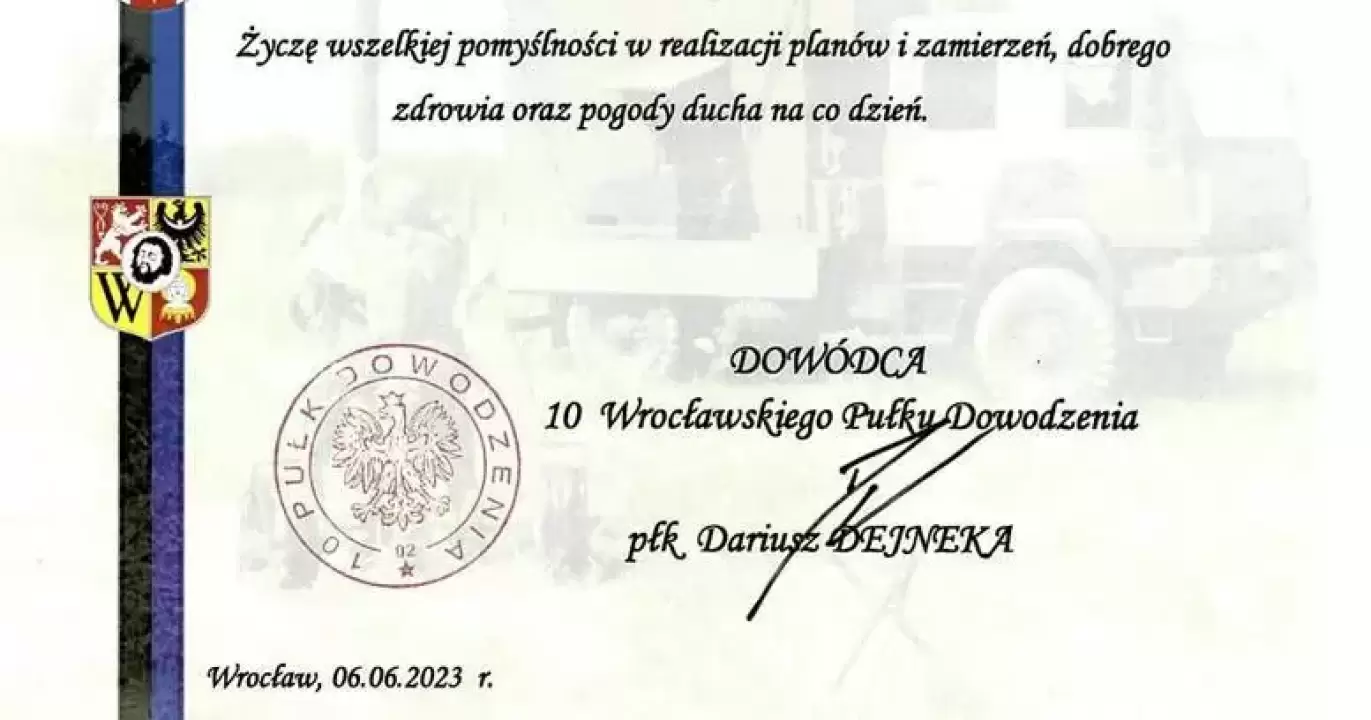 Płk Dariusz Dejneka, dowódca 10. Wrocławskiego Pułku Dowodzenia przesłał do średzkiego magistratu podziękowania za wsparcie w organizacji festynu rodzinnego z okazji święta Wrocławskiego Pułku Dowodzenia, który odbył się 3 czerwca na terenie jednostki.