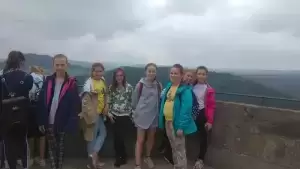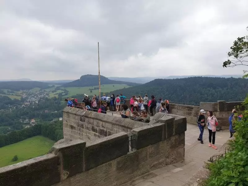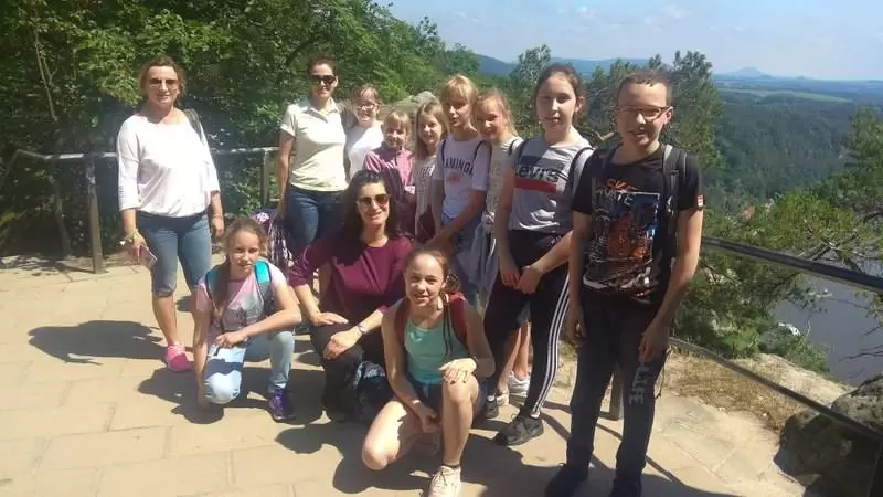 1. III) 7 czerwca 2019 r. odbył się kolejny wspólny wyjazd uczniów uzdolnionych językowo wraz z 4 opiekunkami do Szwajcarii Saksońskiej. Zwiedziliśmy najpierw twierdzę Königstein i obejrzeliśmy w niej skarbiec, zbrojownię, salę historyczną i aprowizacji. Następnie przeszliśmy wzdłuż murów ścieżką panoramiczną z widokiem na Szwajcarię Saksońską, wschodnie Rudawy oraz Drezno. Przy kasie muzealnej i w sklepiku z pamiątkami zakupiliśmy magnesy, pocztówki i breloczki dla naszych bliskich.