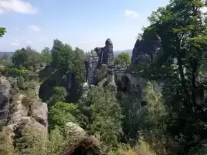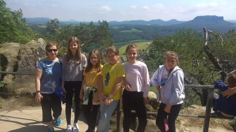 W trakcie zwiedzania znaleźli się pierwsi odważni, którzy próbowali konwersacji w języku niemieckim z innymi turystami. Prym wiodła Nadia z klasy 5d, która zaskoczyła wszystkich odwagą i znajomością języka niemieckiego. Następnie udaliśmy się do Bastei nad Łabą, która nazywana jest perełką Szwajcarii Saksońskiej. Z zachwytem obejrzeliśmy rezerwat skalny z punktami widokowymi i przespacerowaliśmy się wśród niesamowitych form piaskowców z widokami na przełom Łaby i wzgórza Czeskiej Szwajcarii. Przy punktach widokowych zrobiliśmy mnóstwo pamiątkowych zdjęć na tle zapierających dech w piersiach pejzaży.
