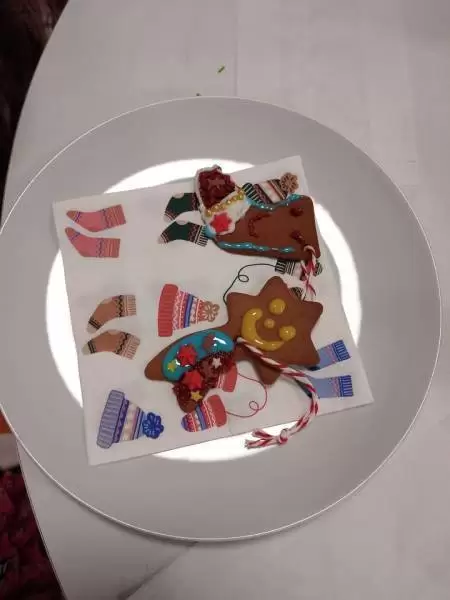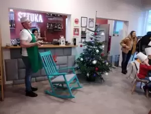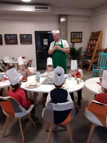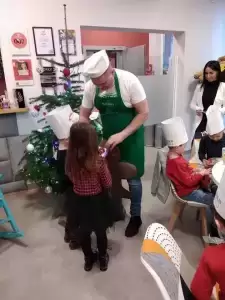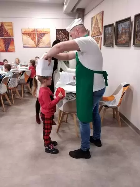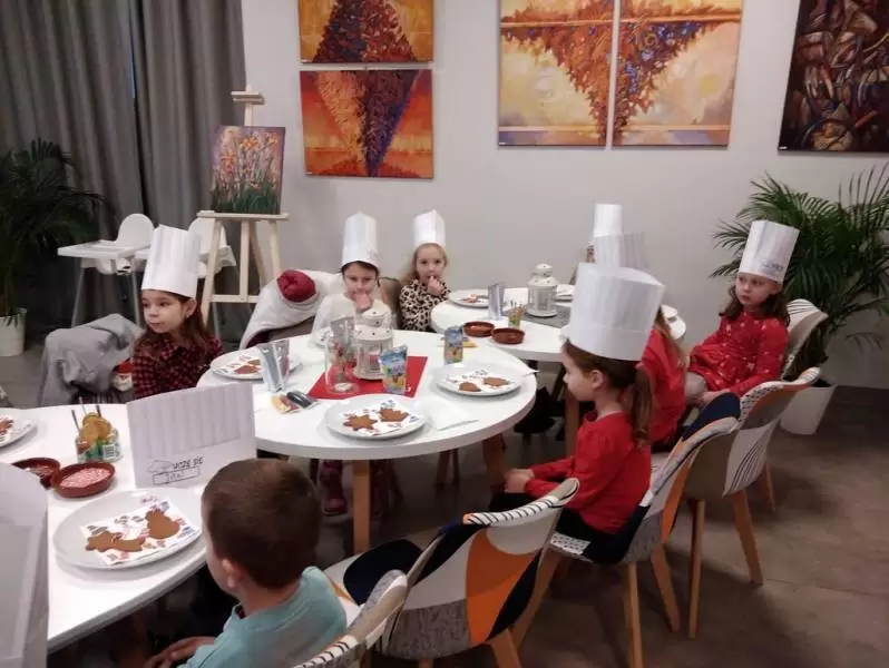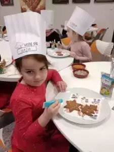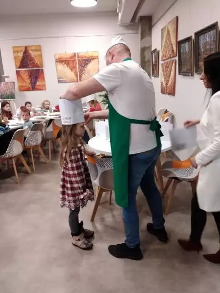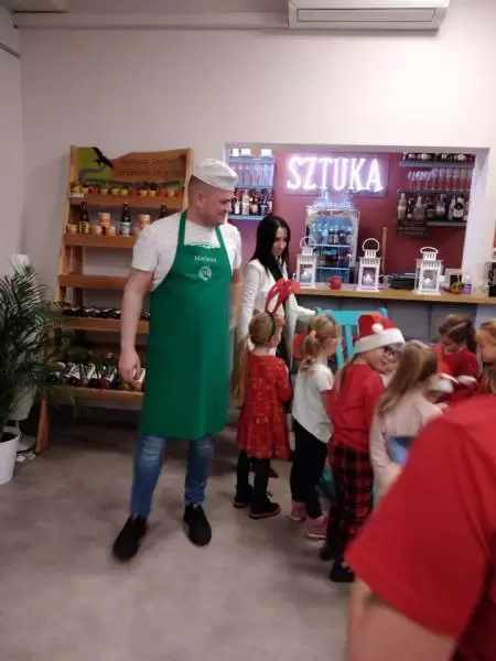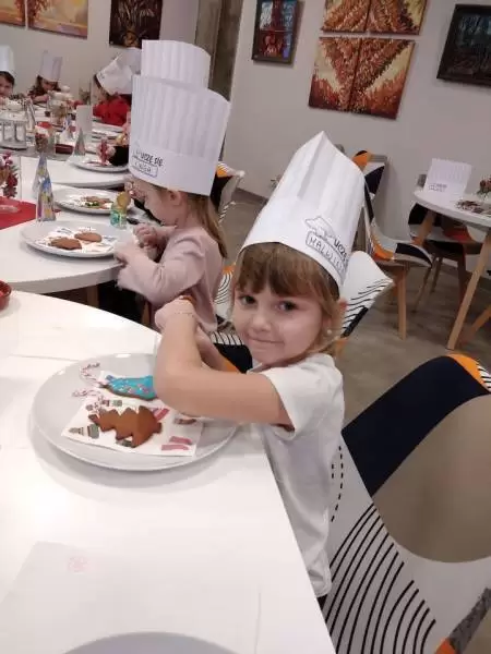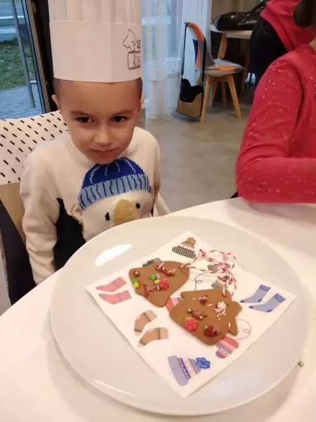 Wizyta wyjątkowego gościa wprowadziła wszystkich w radosny klimat zbliżających się Świąt Bożego Narodzenia. Przedszkolaki z grupy ,,Kotki'' miały przyjemność uczestniczyć w niezwykłych warsztatach cukierniczych zorganizowanych przez Państwa Agnieszkę i Mariusza Komendów, właścicieli restauracji Sztuka Restaurant. Zanim przedszkolaki zaczęły dekorować pierniczki, każdy dostał czapkę ze swoim imieniem na miarę prawdziwego Masterchefa.