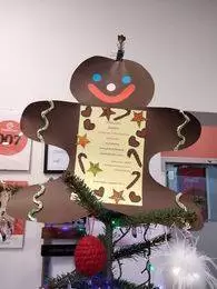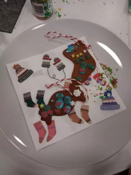 Następnie, przy dźwiękach świątecznej muzyki, dzieci zabrały się do pracy, pięknie ozdabiając ciasteczka, a ograniczała je jedynie wyobraźnia... Na zakończenie ,,Kotki'' podziękowały za świetne zajęcia oraz wspaniale spędzony czas i wręczyły Pani Agnieszce i Panu Mariuszowi śliczną świąteczna bombkę, a także pierniczka, tylko trochę większych rozmiarów i nie tak pysznego, bo wykonanego z papieru :).
