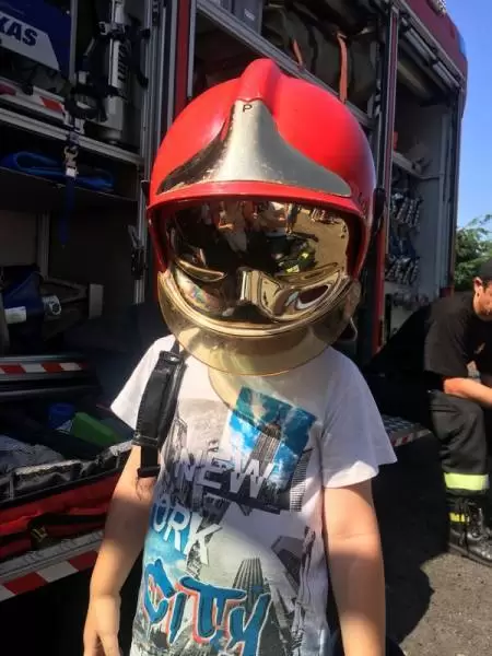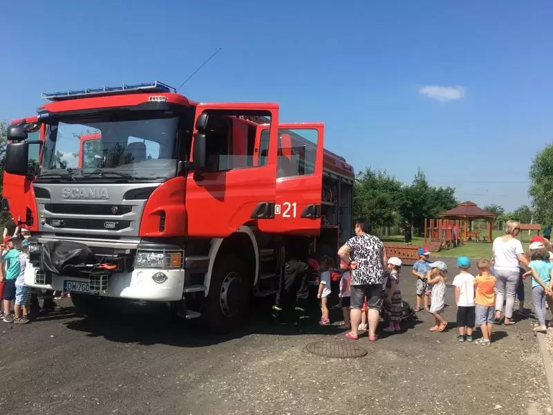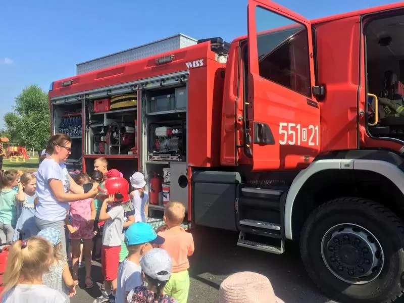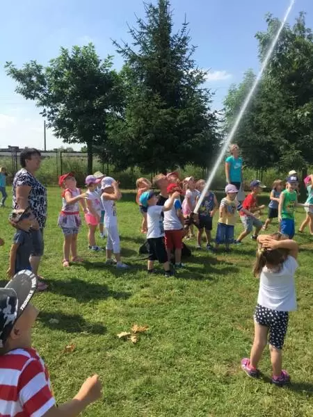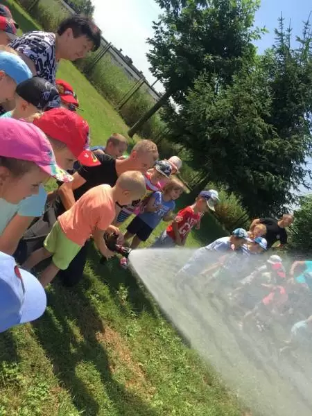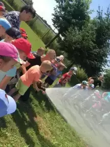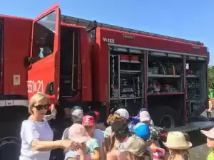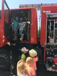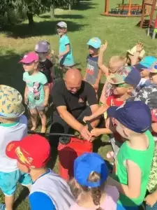 Ponadto w tym dniu nasza placówka gościła funkcjonariuszy straży pożarnej, którzy pokazali dzieciom auto strażackie, zapoznali z jego wyposażeniem oraz opowiadali o pracy strażaka. Główną atrakcją był pokaz lania wody, który ochłodził przedszkolaków w ten upalny dzień.