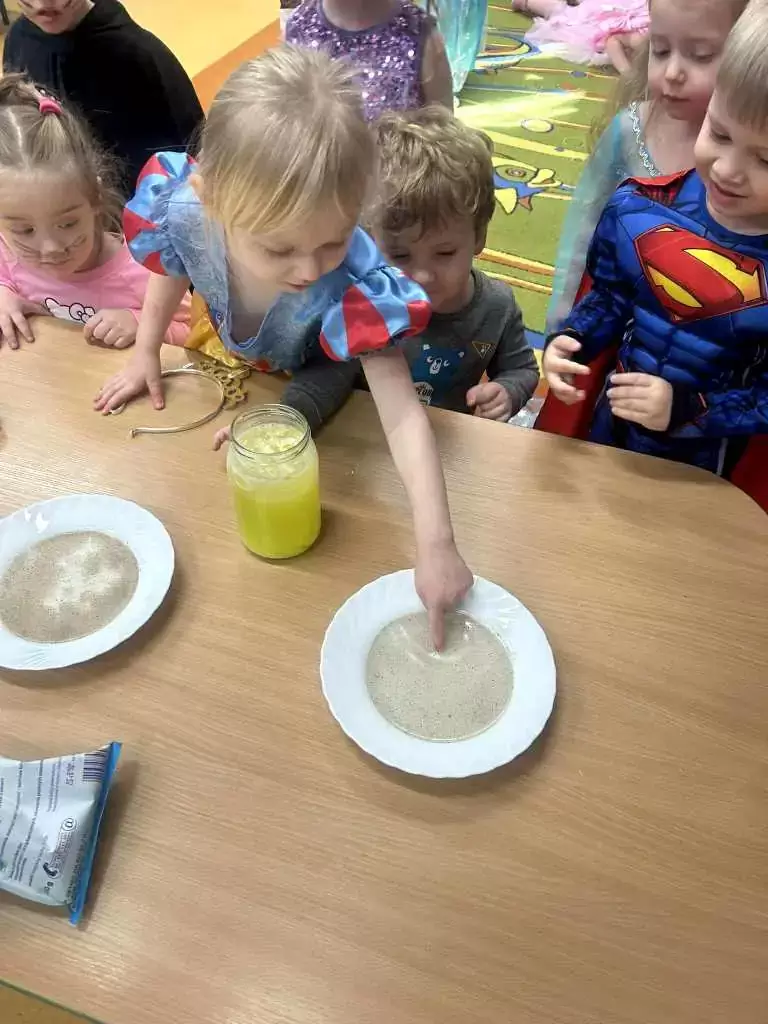 Sala zamieniła się w zaczarowaną krainę, pełną kolorów, symboli i andrzejkowych dekoracji. Przedszkolaki uczestniczyły w licznych zabawach i wróżbach dostosowanych do ich wieku. Było m.in. lanie wosku, losowanie symboli z zabawnymi przepowiedniami, układanie butów, a także wspólne zgadywanki i rozmowy o marzeniach.