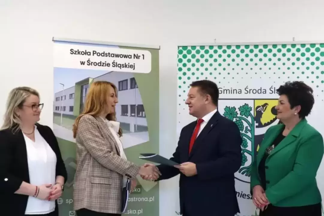 20 lutego we foyer nowo wybudowanej Szkoły Podstawowej nr 1 przy ul. Winogronowej w Środzie Śląskiej burmistrz Adam Ruciński wraz z dyrektorami SP nr 1 podpisali cztery umowy z dostawcami na wyposażenie obiektu.