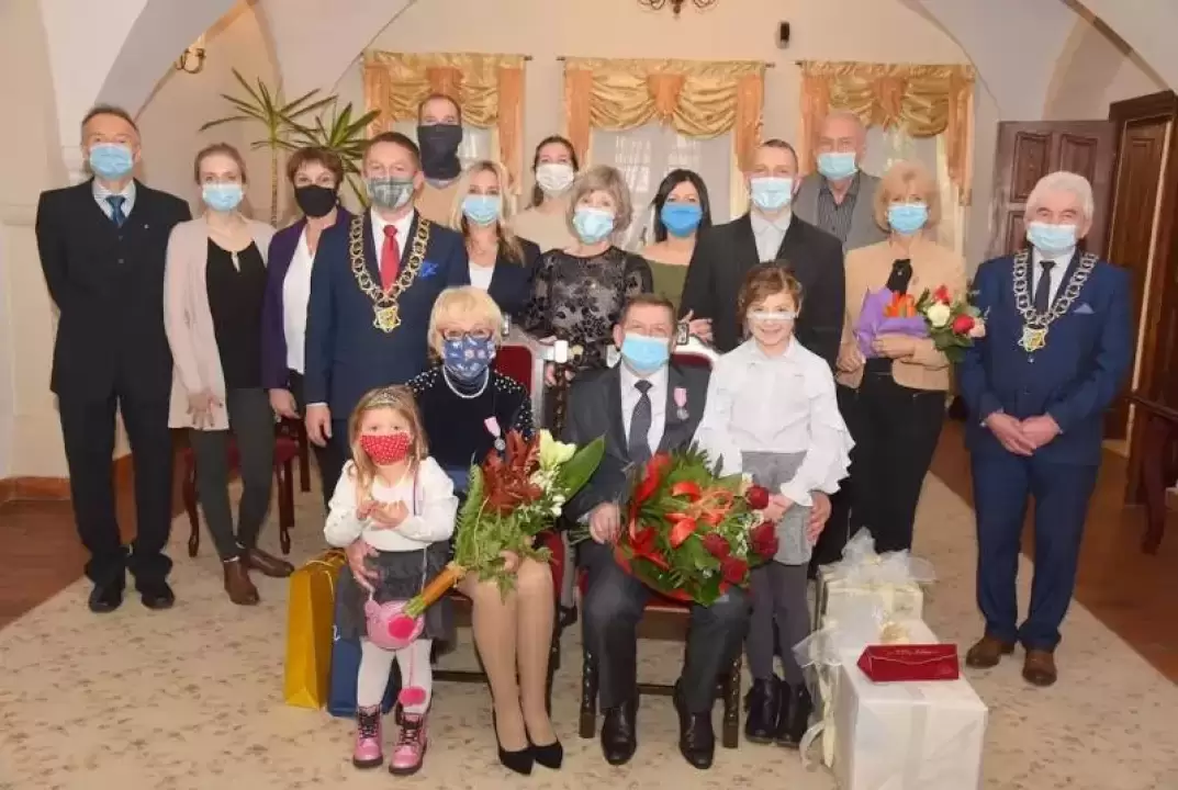 Jubilaci, w gronie licznie przybyłej rodziny i przyjaciół, otrzymali tego dnia medale "Za długoletnie pożycie małżeńskie" nadane przez Prezydenta RP. Burmistrz i Przewodniczący Rady Miejskiej Jerzy Kryciński oraz kierownik USC Monika Kamińska serdecznie pogratulowali Jubilatom. Był toast na ich cześć, smakowity tort, życzenia i prezenty od Rodziny, Przyjaciół i władz Gminy.